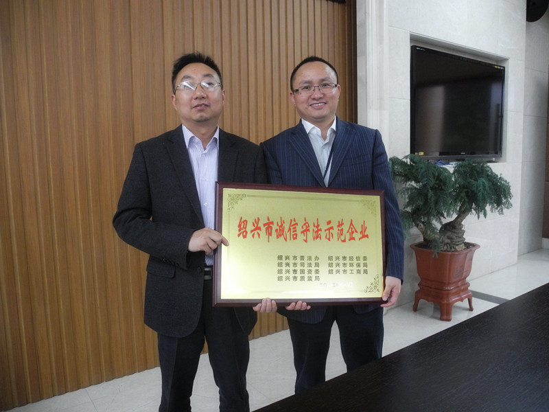 公司一直坚持忠实守信,,,,,,,,依法谋划原则,,,,,,,,经绍兴市普法办、绍兴市经信委、绍兴市司法局、绍兴市环保局、绍兴市国资委、绍兴市工商局、绍兴市质监局等7家部分团结评审,,,,,,,,2013年11月被评定为绍兴市“诚信遵法树模企业”。。。。。。。。